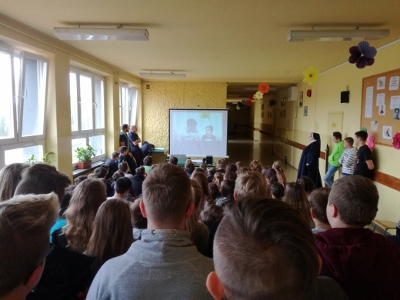 z uczniami na specjalnym apelu, podczas którego
